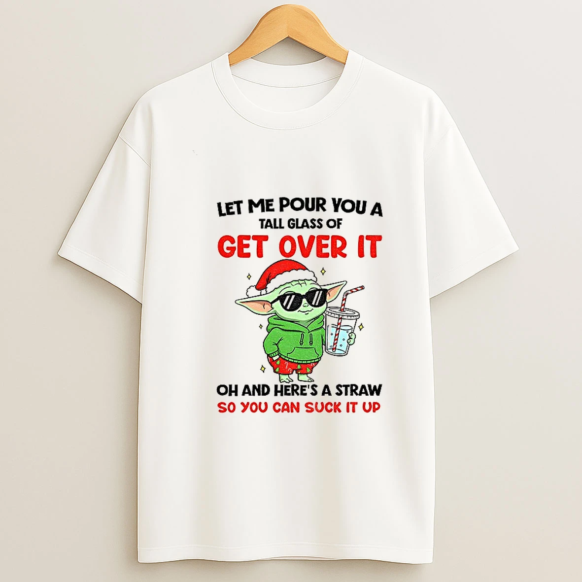 Baby Yoda Santa Hat Let Me Pour You A Tall Glass Of Get Over It Oh And Heres A Straw So You Can Suck It Up Christmas T Shirt