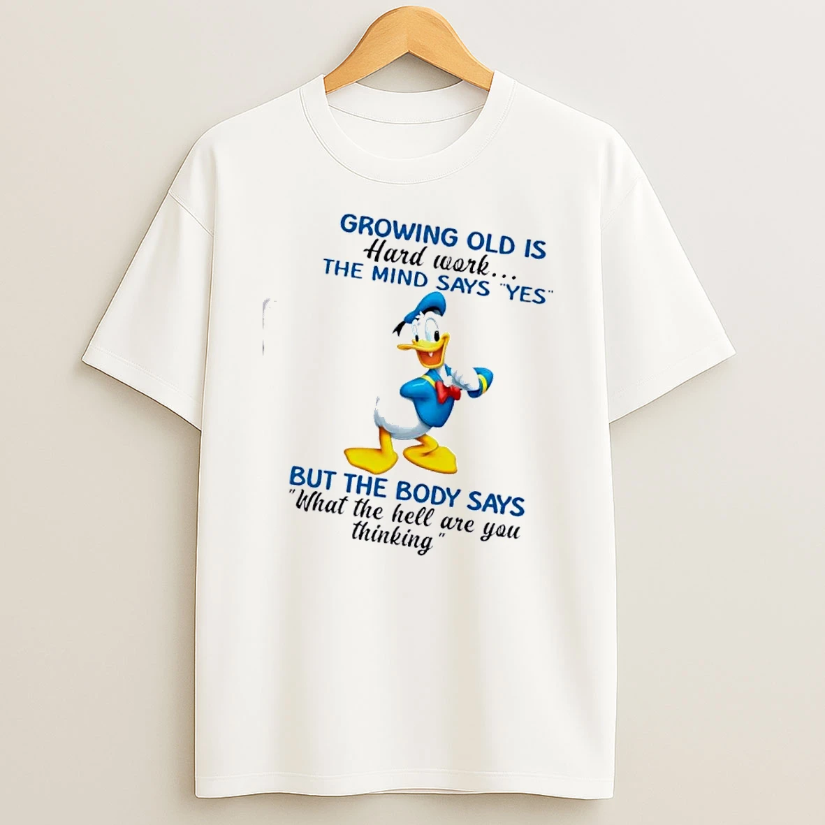 Donald Duck Growing Old Is Hard Work The Mind Says Yes But The Body Says What The Hell Are You Thinking T Shirt