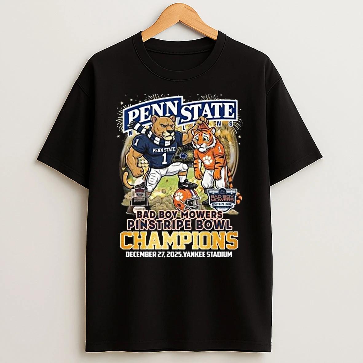 Penn State Nittany Lions Beat Clemson Tigers 2025 Bad Boy Mowers Pinstripe Bowl Champions Mascot T Shirt